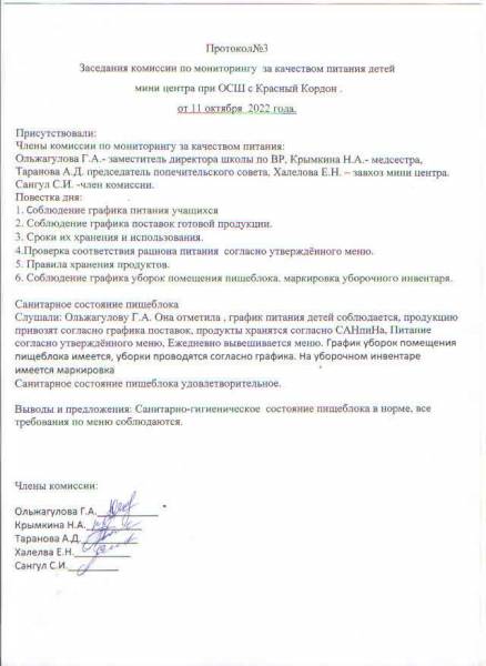 №3 хаттама. 2022 жылғы 11 қазандағы Красный Кордон ауылының НОМ оқушыларының тамақтану сапасына мониторинг жүргізу жөніндегі комиссияның отырыстары