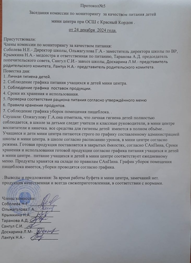 №5 хаттама. 2024 жылғы 24 желтоқсандағы "Красный Кордон ауылының НОМ" жанындағы шағын орталық балаларының тамақтану сапасына мониторинг жүргізу жөніндегі комиссияның отырыстары