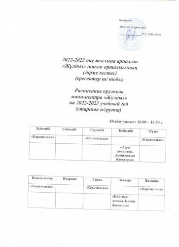 2022-2023 жылдарға арналған шағын орталық үйірмелерінің кестесі (старшая подгруппа)