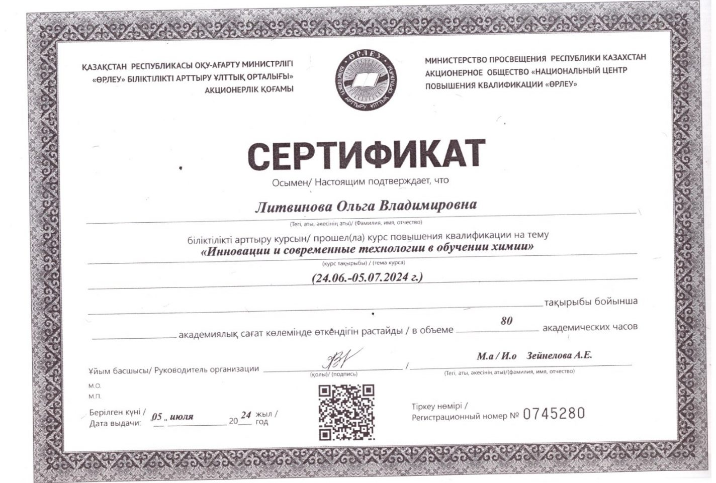 Сертификат. "Химияны оқытудағы инновациялар және заманауи технологиялар" тақырыбында біліктілікті арттыру курсы. "ӨРЛЕУ" БАҰО АҚ 2024ж.
