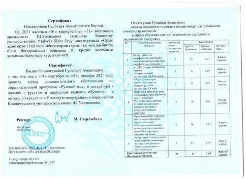 "Орыс және орыс емес тілдері бар мектептегі орыс тілі мен әдебиеті" білім беру бағдарламасы бойынша қосымша білім беру курстарының сертификаты 2021 жыл