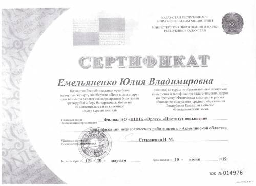 "Дене шынықтыру" пәні бойынша біліктілікті арттыру курстарының сертификаты, АО НЦПК "ӨРЛЕУ" 2019 жыл