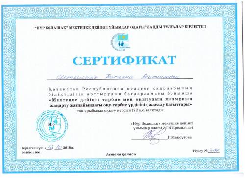 Сертификат "Мектепке дейінгі тәрбие мен оқытудың мазмұнын жаңарту жағдайындағы оқу-тәрбие үрдісінің жасалу бағыттары". 2018 жыл