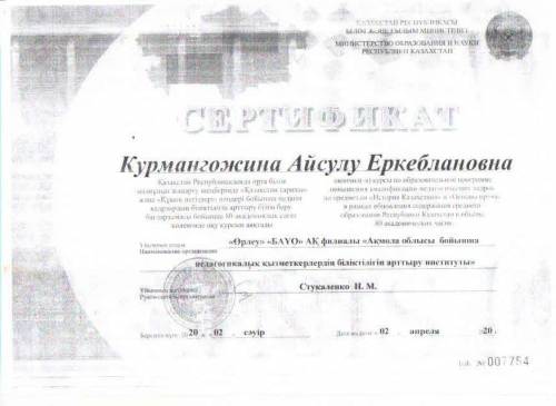 "Қазақстан тарихы" және "құқық негіздері" пәндері бойынша педагогтердің біліктілігін арттыру курстары туралы Сертификат 2020