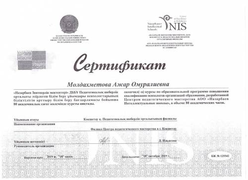 Білім беру ұйымдары психологтарының біліктілігін арттыру курстары туралы Сертификат, ЦПМ 2019 жыл