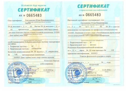 "Дене шынықтыру және спорт мұғалімі" біліктілігін беру туралы Сертификат, 2016 жыл