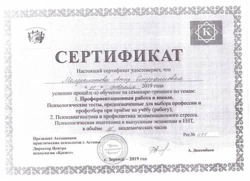 "Мектептегі кәсіптік бағдар беру жұмысы " семинар-тренингінде оқығаны туралы Сертификат. Емтихан стрессінің психодиагностикасы және алдын алу " 2019 жыл