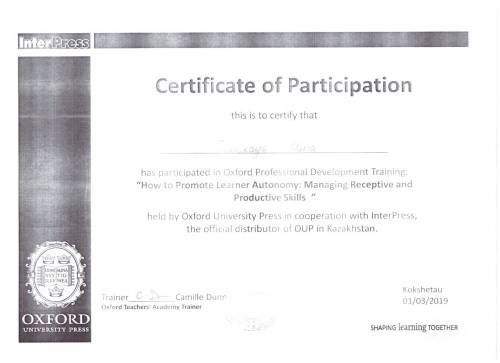 Қатысу сертификаты "оқушылардың автономиясын қалай дамытуға болады: қабылдау және өнімді дағдыларды басқару 2019