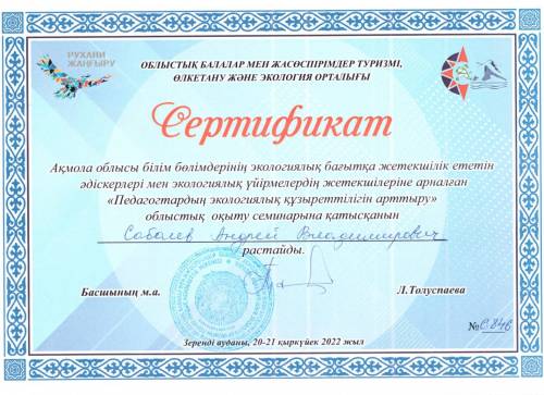 "Педагогтердің экологиялық құзыреттілігін арттыру" облыстық оқыту семинарының сертификаты 2022 жыл