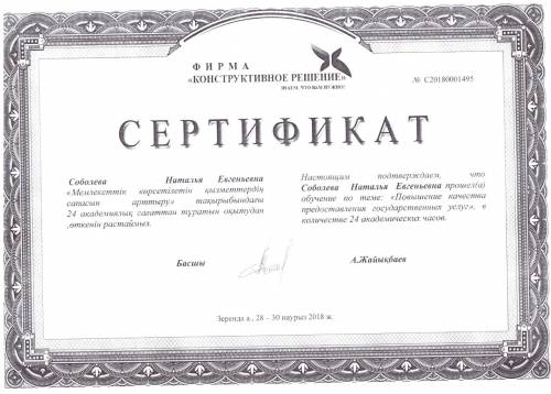 "Мемлекеттік қызмет көрсету сапасын арттыру" тақырыбы бойынша оқыту сертификаты 2018 жыл