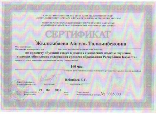"Қазақстан Республикасының орта білім мазмұнын жаңарту шеңберінде қазақ тілінде оқытатын мектептердегі Орыс тілі" пәні бойынша Сертификат 2016 жыл