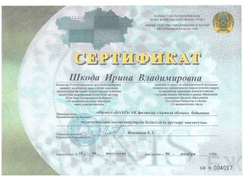 Орыс тілінде оқытатын мектептерде бастауыш сынып пәндері бойынша педагог кадрлардың біліктілігін арттыру сертификаты, "ӨРЛЕУ" БАҰО АҚ 2016 жыл