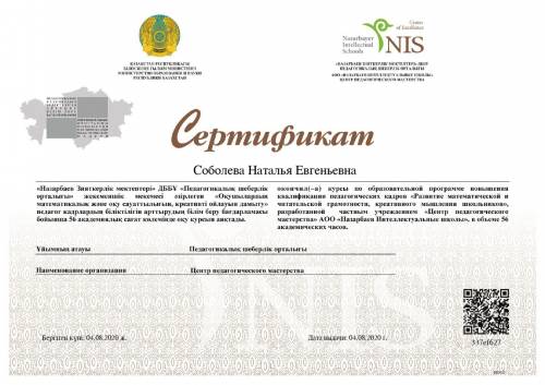 "Оқушылардың математикалық және оқу сауаттылығын, шығармашылық ойлауын дамыту" педагог кадрлардың біліктілігін арттыру сертификаты 2020 жыл