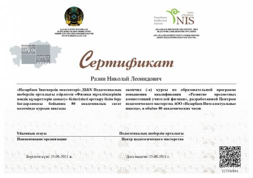 "Физика мұғалімдерінің пәндік құзыреттілігін дамыту" біліктілікті арттыру сертификаты 2021 жыл