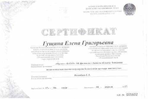 Бастауыш сынып мұғалімдерінің біліктілігін арттыру сертификаты. "ӨРЛЕУ" БАҰО АҚ 2017 ЖЫЛ