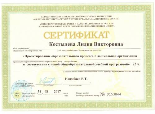 "ӨРЛЕУ "БАҰО АҚ" 2017 жыл "жаңа жалпы білім беретін оқу бағдарламасына сәйкес мектепке дейінгі ұйымдағы білім беру процесін жобалау" сертификаты