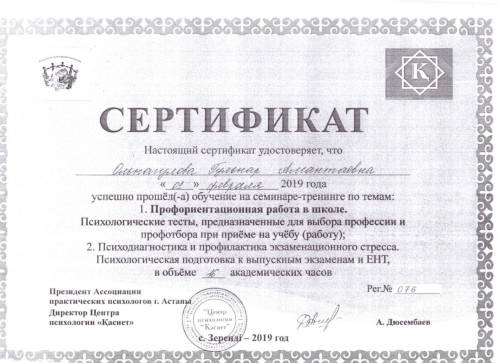 Сертификат "мектептегі кәсіптік бағдар беру жұмысы. Емтихан стрессінің психодиагностикасы және алдын алу " 2019 жыл