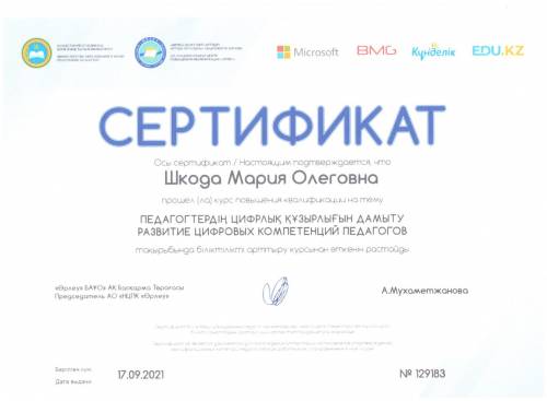 "ӨРЛЕУ" БАҰО АҚ педагогтерінің цифрлық құзыреттілігін дамыту " сертификаты 2021