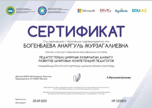"ӨРЛЕУ" НЦПК АО "Педагогтардың цифрлық құзыреттілігін дамыту" сертификаты 2021 жыл