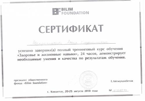 Сертификат "денсаулық және өмірлік дағдылар" тренингтік курсы BF 2018 жыл