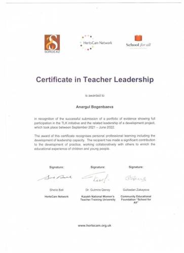 "Certificate Teacher Leadership" жобасы үшін Сертификат. 2021-2022 жыл