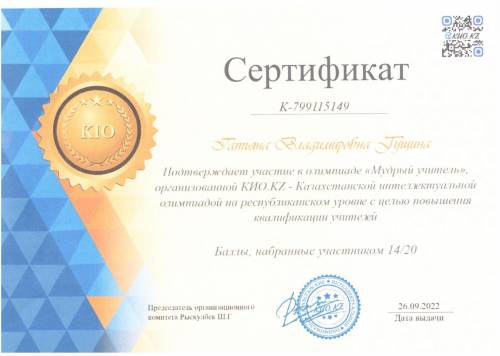 Мұғалімдердің біліктілігін арттыру мақсатында "Дана мұғалім" олимпиадасына қатысқаны үшін Сертификат. 2022 жыл