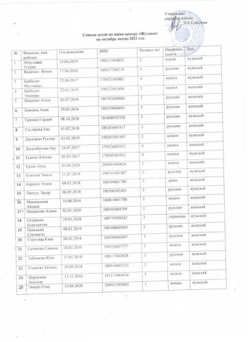 2021 жылдың қазан айына арналған шағын орталықтың балалар тізімі