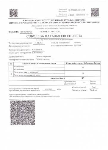 ҰБТ өткендігі туралы анықтама, педагог-сарапшы 2022 жыл