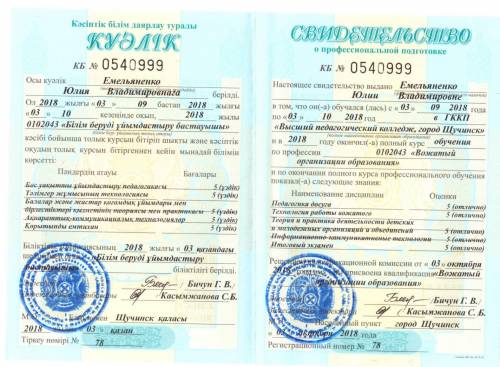 "Білім беру ұйымының кеңесшісі" мамандығы бойынша кәсіптік даярлау туралы куәлік 2018 жыл