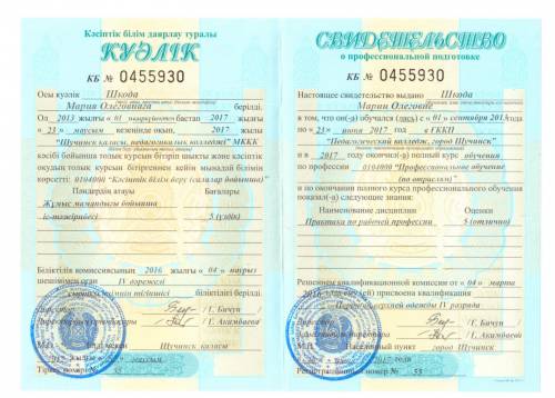 Салалар бойынша "кәсіптік оқыту" кәсіптік даярлау туралы куәлік