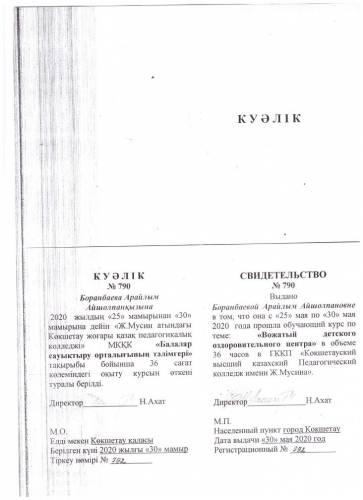 "Балалар сауықтыру орталығының тәлімгері" курсын өткендігі туралы куәлік 2020 жыл
