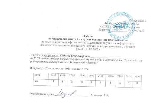 Информатика мұғалімінің кәсіби құзыреттілігін дамыту " тақырыбы бойынша біліктілікті арттыру курстарына қатысу табелі 2022 жыл