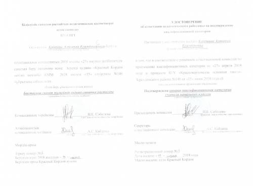Бастауыш сынып мұғалімдерінің біліктілік екінші санатын растау туралы куәлік 2018 жыл