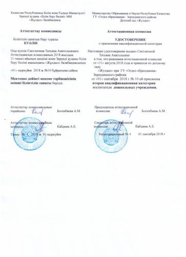 2018 жылғы "Мектепке дейінгі мекемелердің тәрбиешісі" екінші санатын беру туралы куәлік