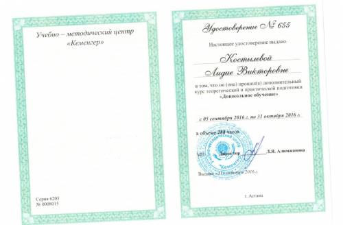"Мектепке дейінгі оқыту" теориялық және практикалық даярлықтың қосымша курсынан өткені туралы куәлік 2016 жыл