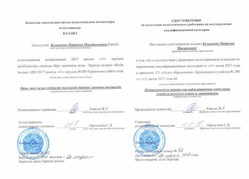 Педагог қызметкерді орыс тілі мен әдебиеті мұғалімінің бірінші санатын растауға аттестаттау туралы куәлік, 2017 ЖЫЛ