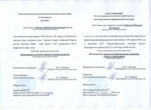 Математика мұғалімінің бірінші санатын беруге педагог қызметкерді аттестаттау туралы куәлік 2018 жыл