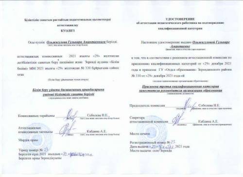 Білім беру ұйымы басшысының орынбасарының үшінші санатын беруге педагог қызметкерді аттестаттау туралы куәлік 2021 жыл