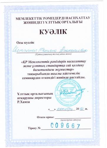 "Ұлттық стандарттарға сәйкес ҚР Мемлекеттік рәміздерін насихаттау және қолдану жөніндегі жұмыс" куәлігі 2019 жыл