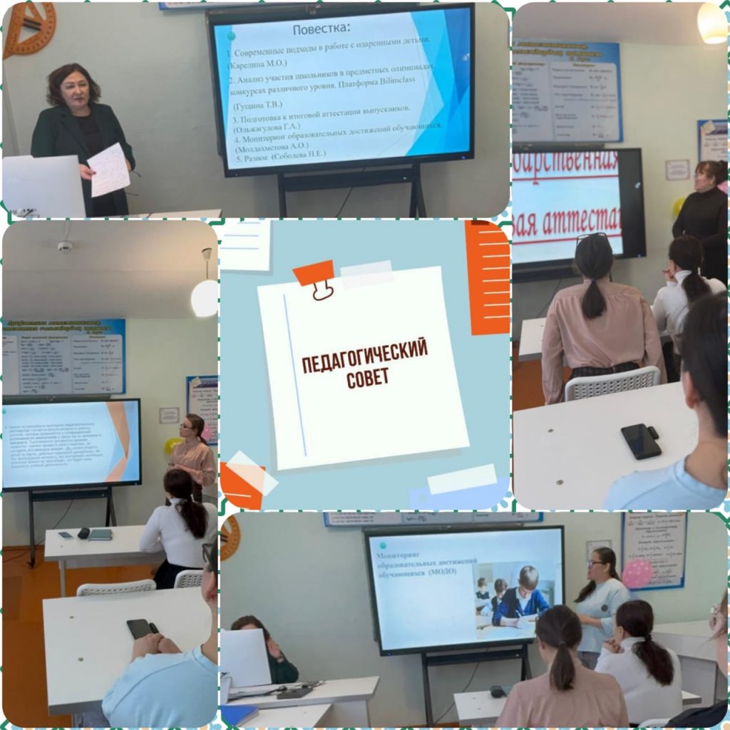 № 3 педагогикалық кеңесте мұғалім М.О. Карелина "Оқушылардың жобалау-зерттеу қызметі мотивацияны арттыру құралы ретінде" тақырыбында баяндама жасады.